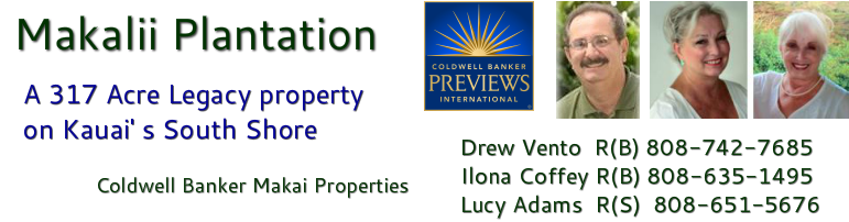Drew Vento, R(B) 808-742-7685 Drew@drewsnews.com Ilona Coffey, R(B) 808-635-1495 ilona@kauaiagent.com Lucy Adams, R(S) 808-651-5676 lucy@kauaiagent.com Coldwell Banker Makai Properties |